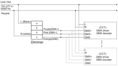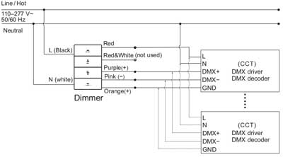 Remarque 2 : Le variateur et le pilote/décodeur DMX sont connectés indépendamment à l'alimentation d'entrée (secteur CA)