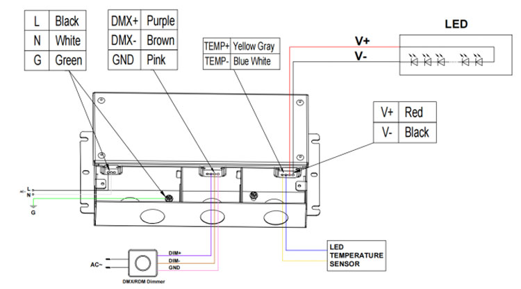 1. Le nom du modèle SMT - Californie xx060-DMXJ signifie qu'il n'y a pas de détection de température de lampe, donc le pilote LED n'a pas de câblage de détection de température de lampe.