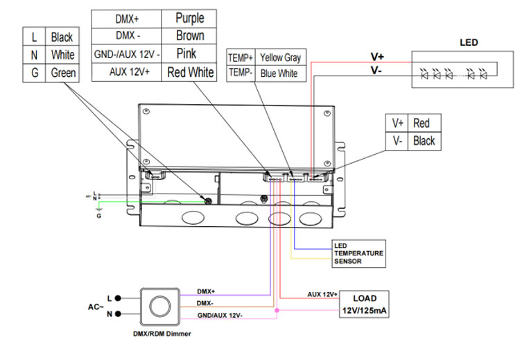 3. Le nom du modèle SMT - Californie xx0 8 0-DMXJ-T signifie qu'il n'y a pas d'alimentation auxiliaire mais qu'il y a une détection de température de la lampe, donc le pilote LED n'a pas de câblage d'alimentation auxiliaire.