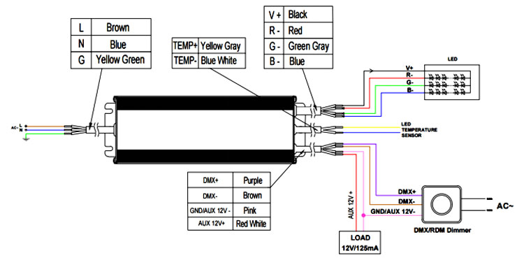 3. Le nom du modèle SMT - Californie xx 300 -DMX UN -T signifie qu'il n'y a pas d'alimentation auxiliaire mais qu'il y a une détection de température de la lampe, donc le pilote LED n'a pas de câblage d'alimentation auxiliaire.